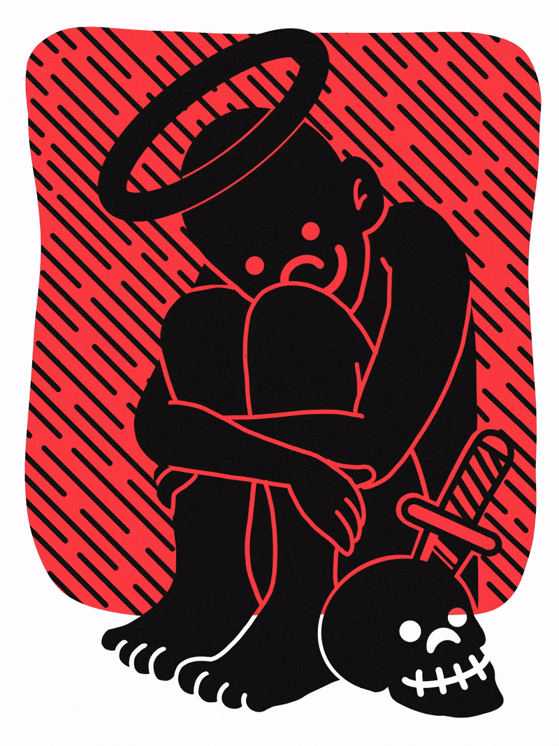 Toxic positivity, religious motifs, the pain within held back by a smile.